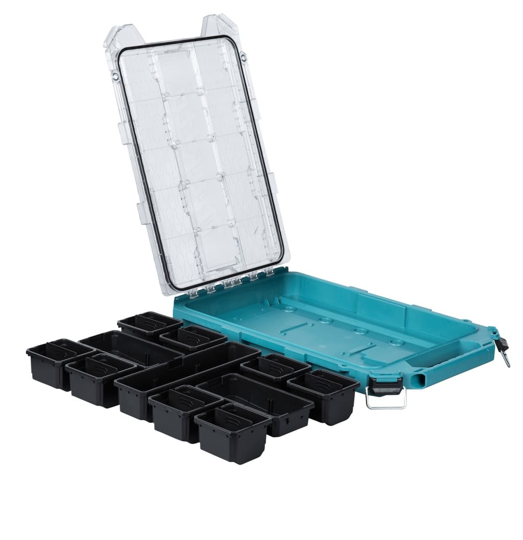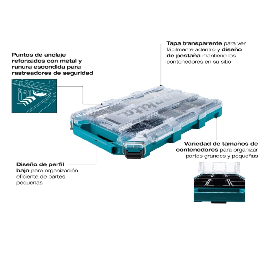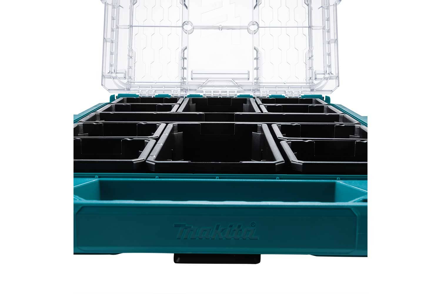 MAKTRAK™ de Makita es la Nueva Generación en almacenamiento modular. El Organizador de Bajo Perfil Mediano MAKTRAK™ T-90059 es una solución de almacenamiento modular para transporte, acceso, almacenamiento y organización de equipo y herramientas para el sitio de trabajo, y hasta 50% más capacidad de almacenamiento versus la competencia. Tiene la capacidad de 8,14 L. con pestillos grandes compatibles con guantes para fácil acceso y una tapa transparente para ver dentro fácilmente.